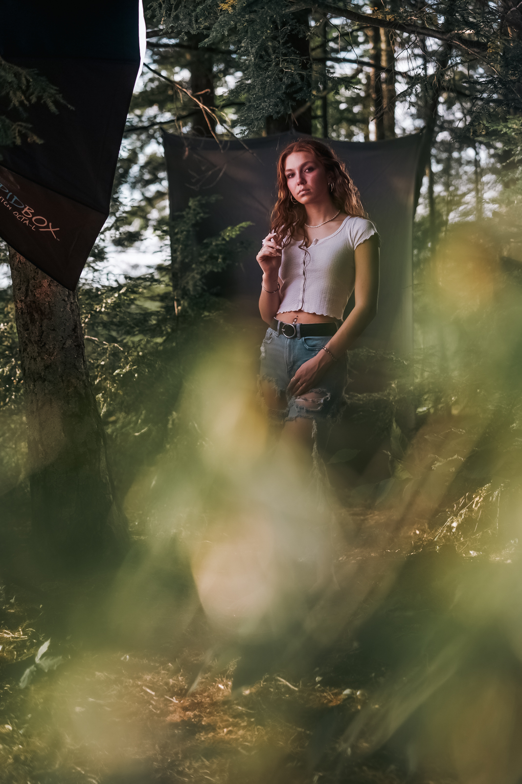 A few years back I was watching a documentary where the cinematographer had shot their interviews outdoors on location - but they had also placed a seamless backdrop behind their subject, and shot wide, showing you the entire scene (lighting and all). I liked seeing the “cluttered” look of the entire scene, while keeping the subject’s background perfectly polished and clean with the seamless paper. Shortly after, I was taking photos of my cousin for her senior portraits, and figured I’d give that look a try. It’s a little unconventional for a senior portrait, but I figured, after I got the “safe” shots, I’d try a few that were more “for me”.